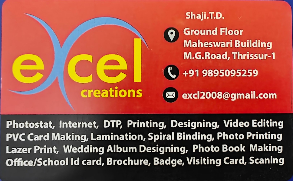 Excel has been Thrissur's trusted printing, photostat, and xerox center since 2006. Conveniently located on MG Road, we offer a wide range of high-quality printing and design services tailored to meet your needs. Our team of professional designers, with over 20 years of experience, specializes in creating ID cards, posters, brochures, tags, visiting cards, hotel menus, restaurant menus, and more. Our key services include: Graphic Designing PVC ID Card Designing and Making (Office & School ID Cards) Photostat/Xerox DTP (Malayalam & English) General Printing Photo Printing (Passport Size) Brochures, Badges & Visiting Cards Design Lamination Spiral Binding Scanning Laser Printing Visit us for quick, reliable, and professional service